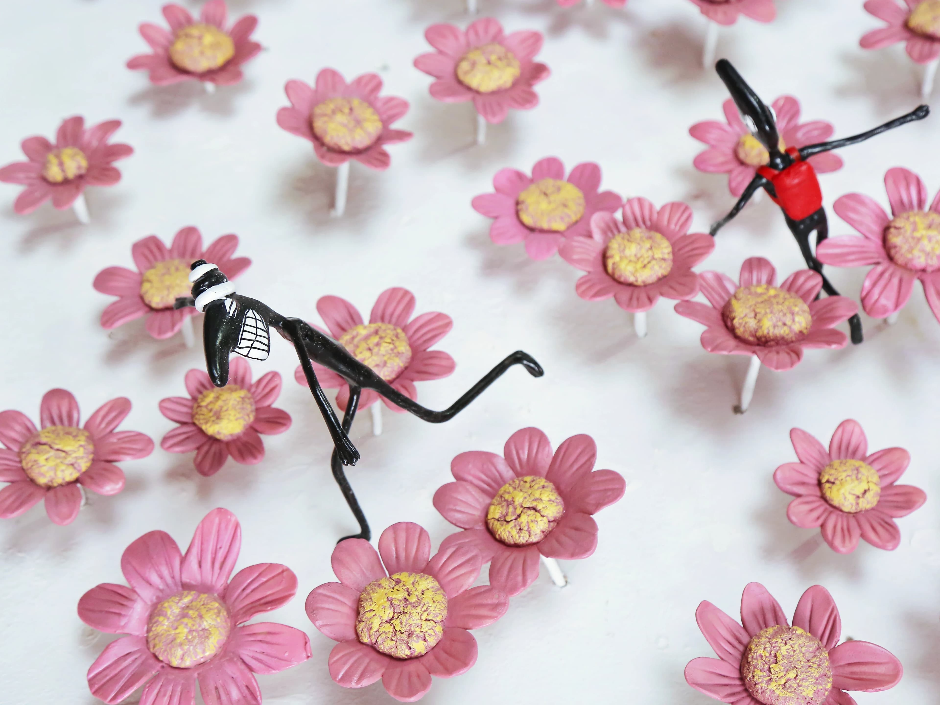 A fluid collection comprising epoxy daisies, asters, and orchids, along with fun characters, screwed onto walls, Flower Campus is not merely decorative but also serves as a profound symbol of transience and renewal. The installation, in the strictest sense, has no fixed shape or contour, yet it is flexible enough to transform into the shape the observer envisions. It reflects the meadow of daisies in the viewer’s heart while maintaining its own individuality and uniqueness. It is, at once, both one and all, highlighting the fleeting beauty and rejuvenation of flowers every spring.
